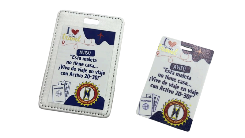 En poliéster con espacio para tarjetas, ideal para organizar tus documentos de viaje. Cuenta con una placa metálica grabada con láser del logo de Activo 20-30, añadiendo un toque exclusivo y profesional. Su diseño compacto y resistente lo hace perfecto para mantener tu pasaporte y tarjetas seguras.